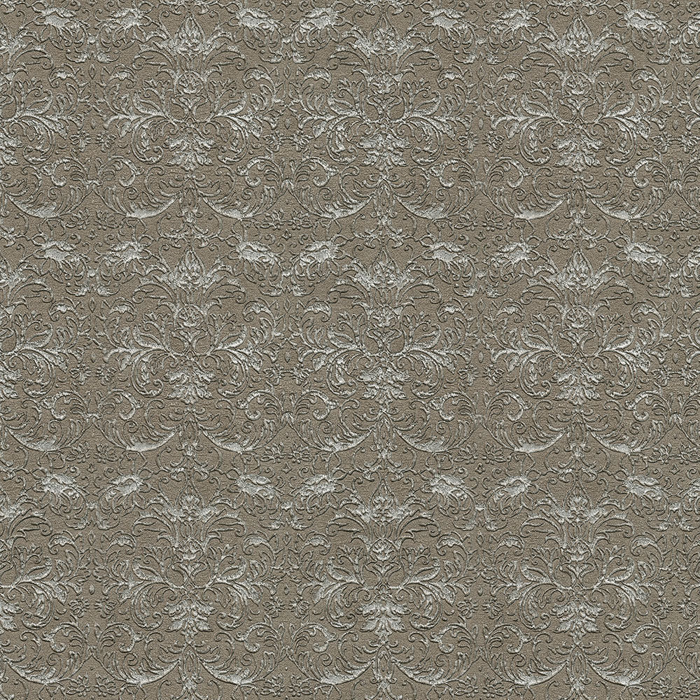 Šíře role 1,06 m. Luxusní vliesové tapety s vinylovým povrchem inspirované krásou italských historických paláců - ornamentální vzor, plastická textura v odstínech metalické hnědé, vzor stříbrný. Snadno zkombinujete se souvisejícími tapetami.