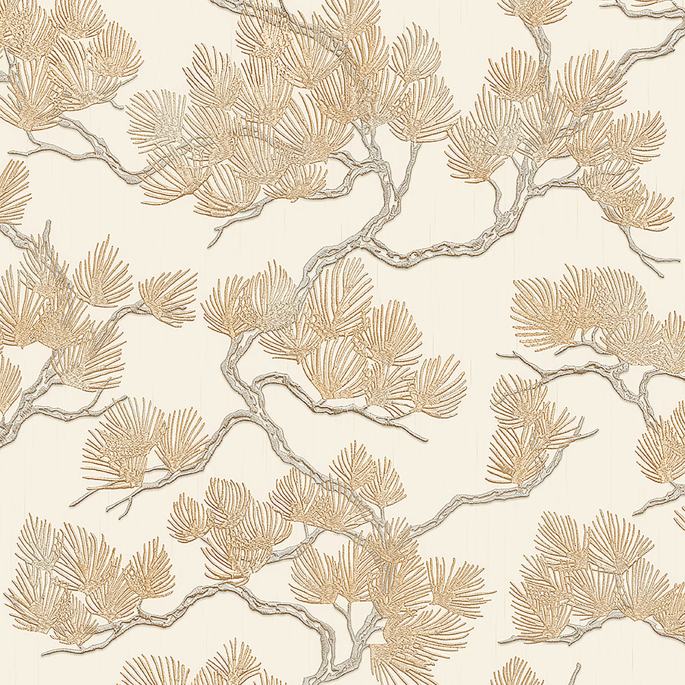 Luxusní krémová vliesová tapeta s vinylovým povrchem, pololesklé šedo-krémovo-béžové větvičky stromu.