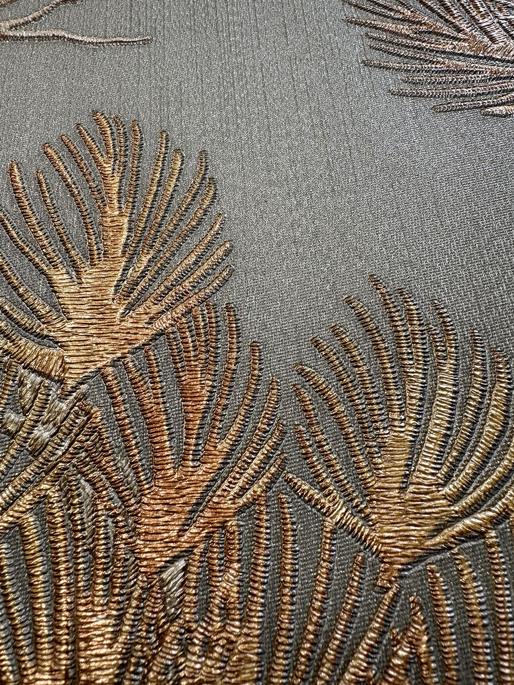 Luxusní šedo-zelená vliesová tapeta s vinylovým povrchem, pololesklé měděné a šedé větvičky stromu.