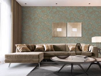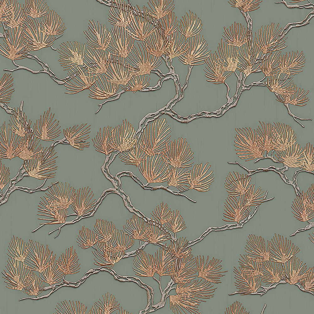 Luxusní šedo-zelená vliesová tapeta s vinylovým povrchem, pololesklé měděné a šedé větvičky stromu.