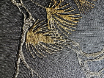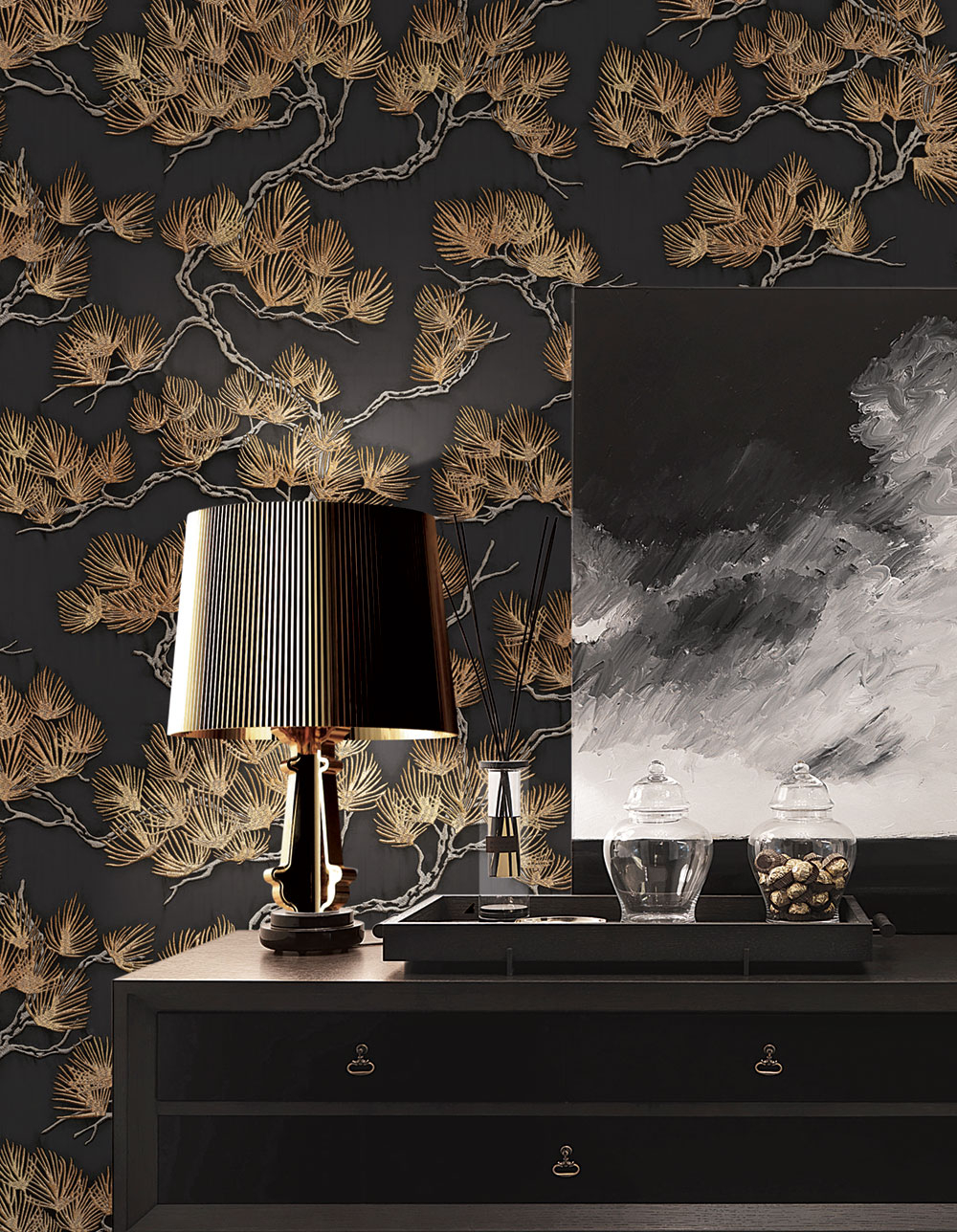 Luxusní černá vliesová tapeta s vinylovým povrchem, hnědo-bronzové větvičky stromu.
