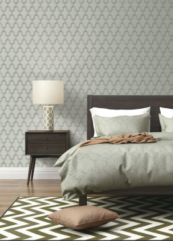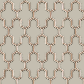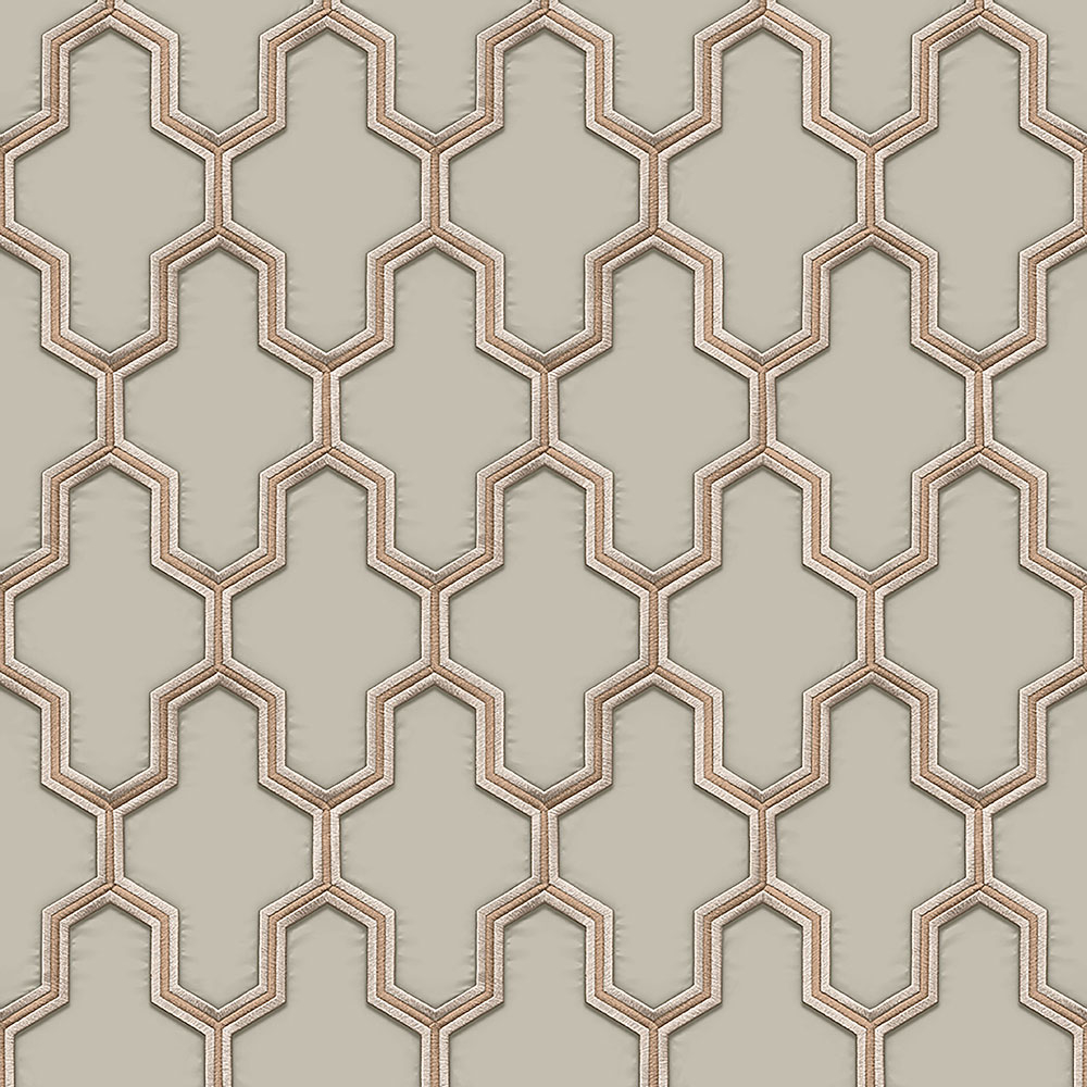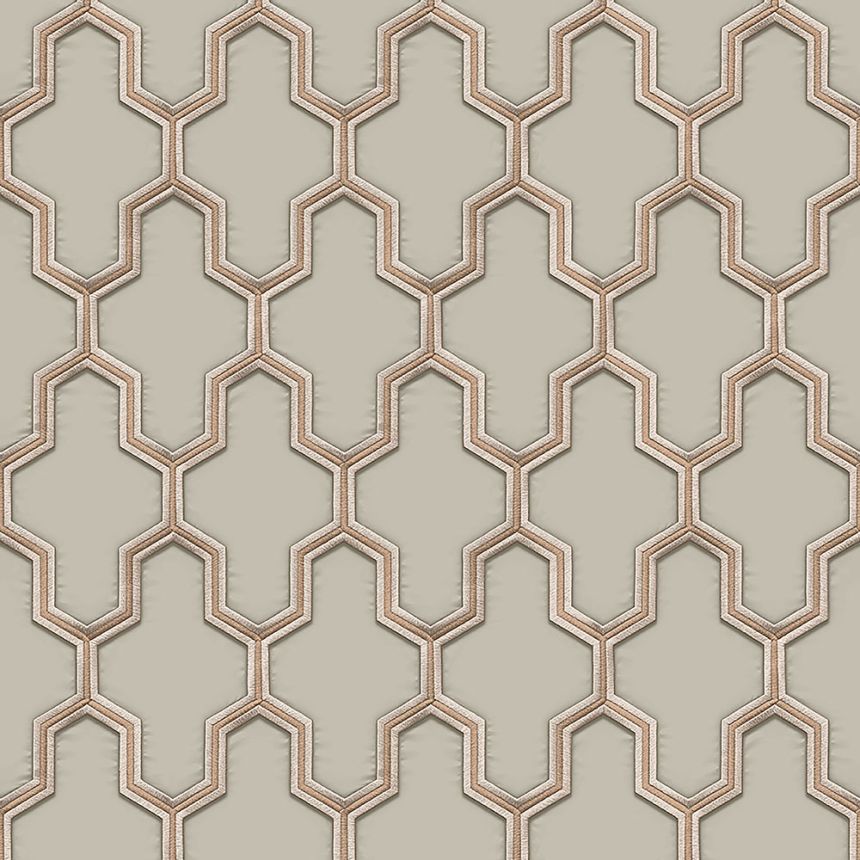 Hnědo-béžový vyšívaný vzor ve stylu Art Deco na vliesové tapetě s šedým podkladem.