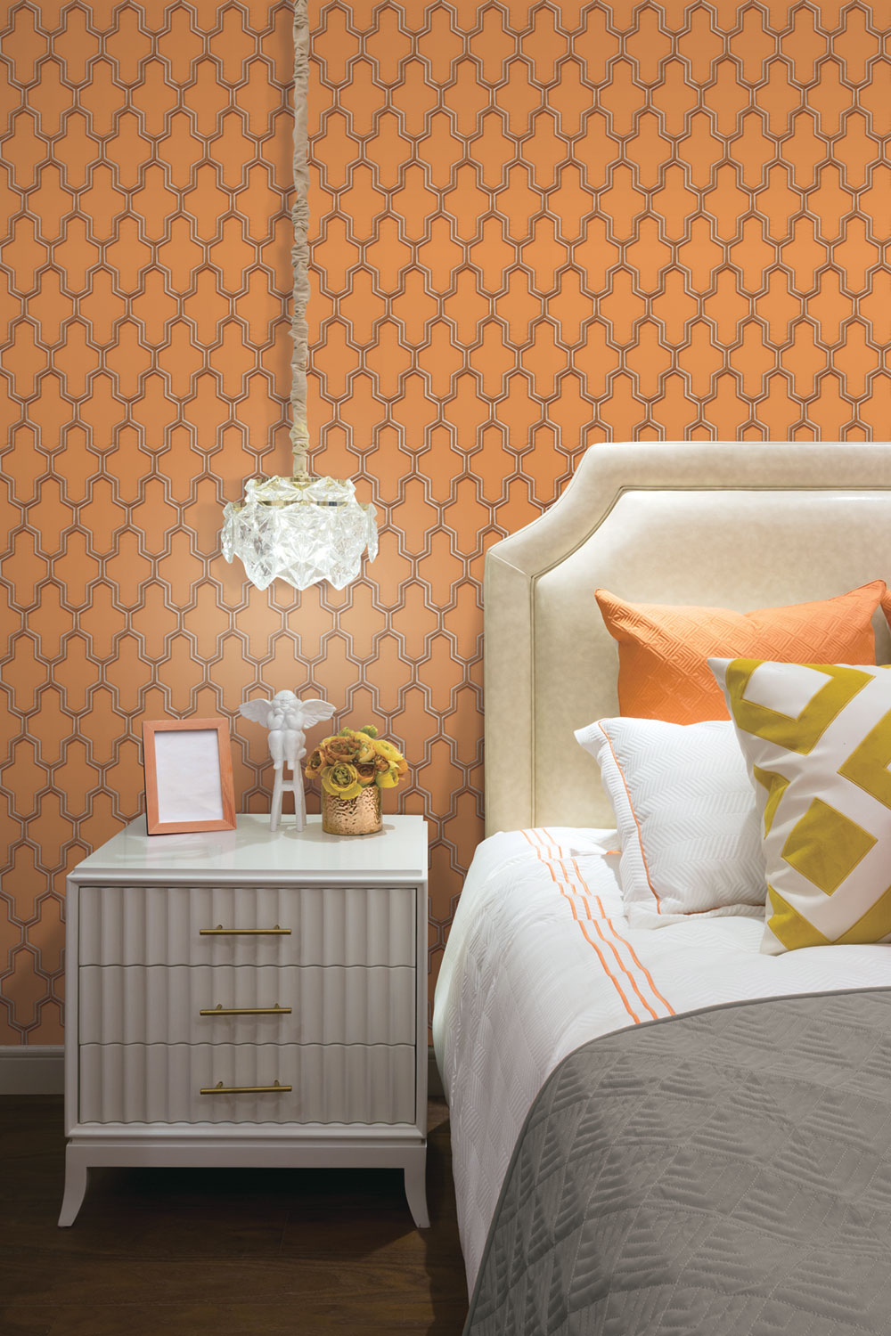 Hnědo-béžový vyšívaný vzor ve stylu Art Deco na vliesové tapetě s oranžovým podkladem.