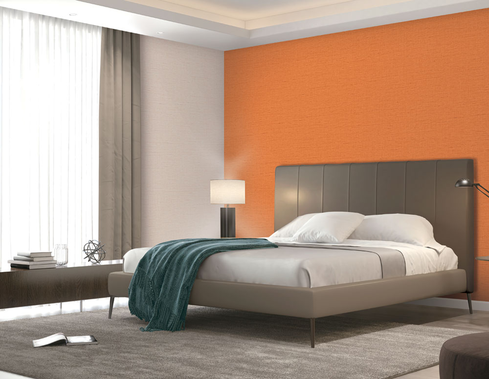 Oranžová vliesová tapeta na zeď ve vzhledu látky.