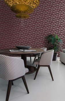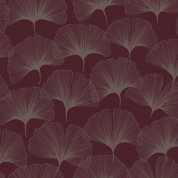 Vínová vliesová tapeta na zeď, metalické stříbrné obrysy listů Ginkga.