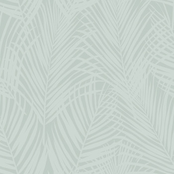 Vliesová tapeta na zeď, metalický stříbrný podklad, matné světle zelené palmové listy.