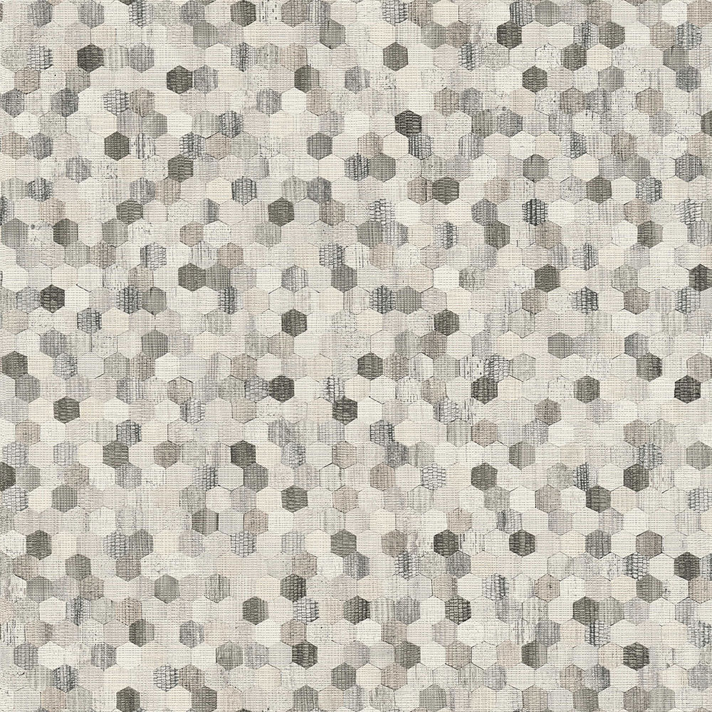 Geometrická vliesová tapeta na zeď, šedo-bílé hexagony.
