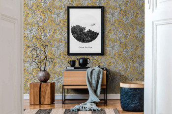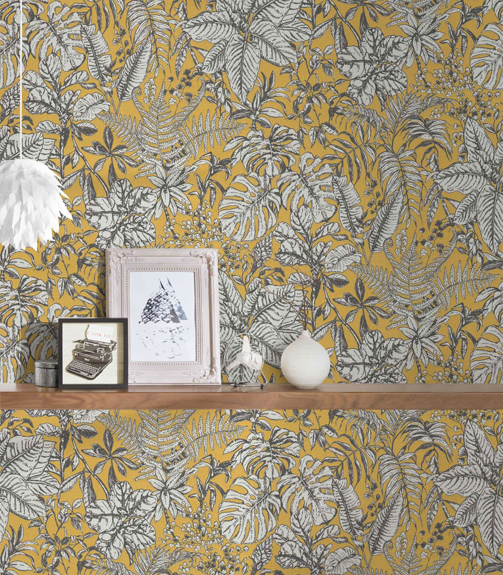 Okrová vliesová tapeta na zeď, vzor tropických listů.