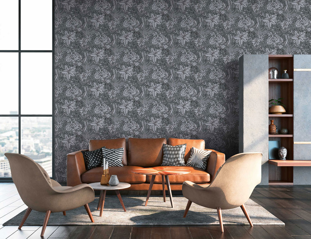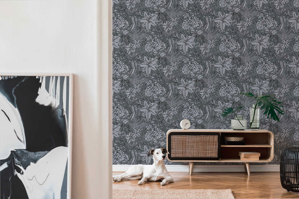 Šedá vliesová tapeta na zeď, motiv tropických listů.