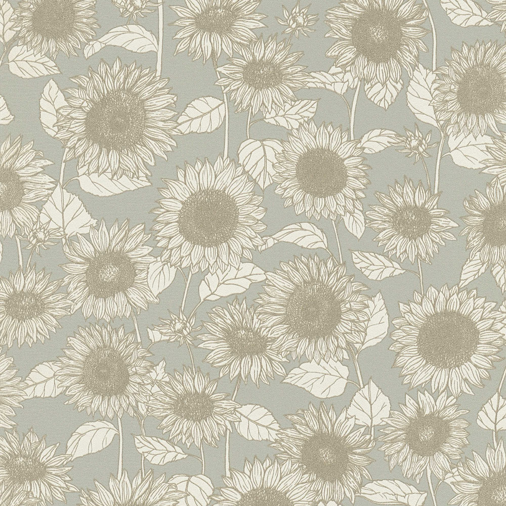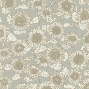 Vliesová květinová tapeta na zeď, motiv slunečnic na šedém podkladu.