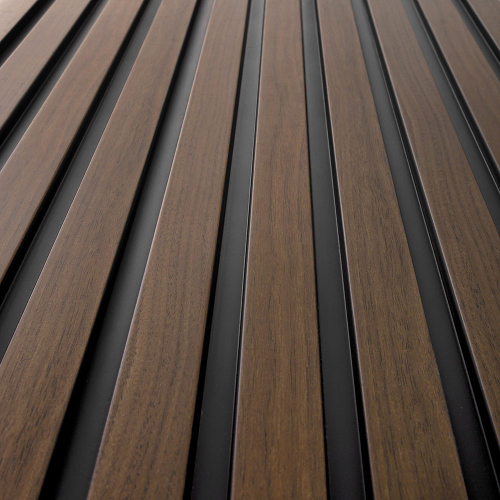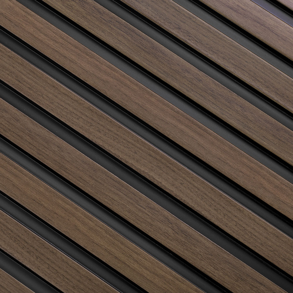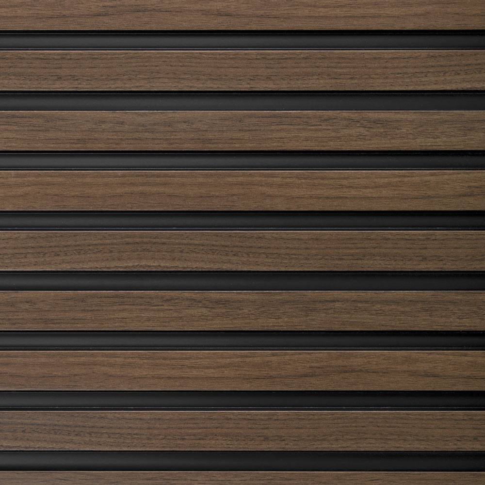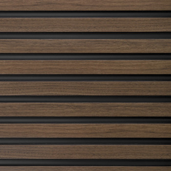 Dekorační lamely z odolného materiálu, dekor tmavý dub, vhodné do jakékoli místnosti, jako je koupelna, hala nebo obývací pokoj.