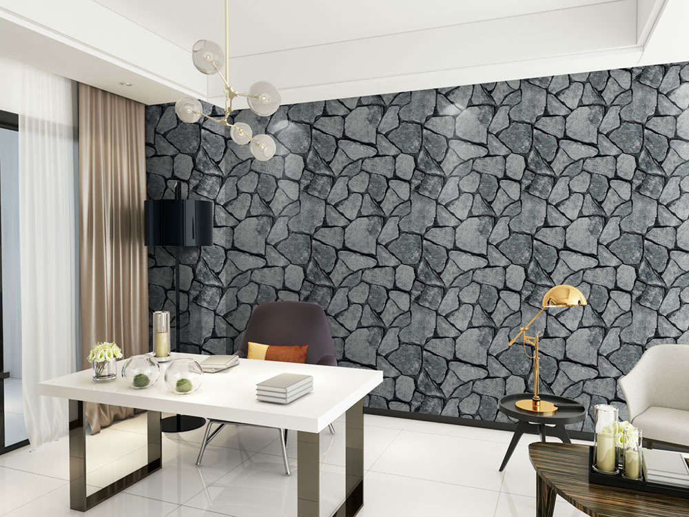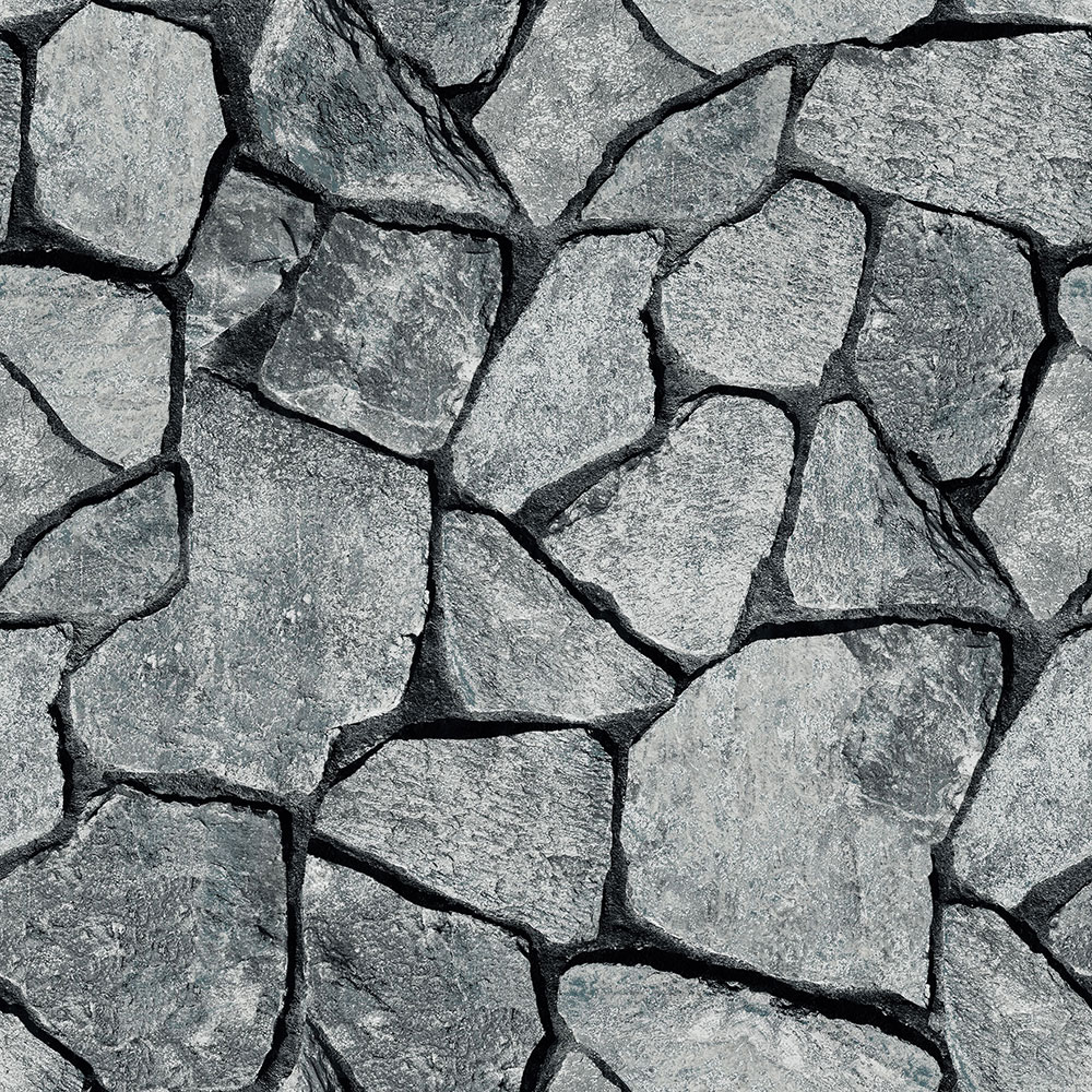 Omyvatelná vinylová tapeta. Dekor strukturované šedé kamenné stěny s černými spárami; krupičková textura.