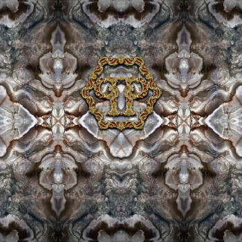 Luxusní vliesová obrazová tapeta s abstraktním šedo-hnědým motivem a logem PP na strukturovaném podkladu.