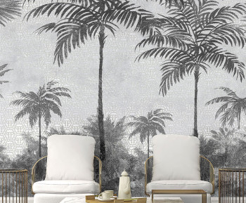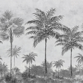 Luxusní vliesová obrazová tapeta v šedých tónech s motivem palem. Na pozadí loga PP. Podklad s hrubou textilní strukturou.