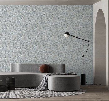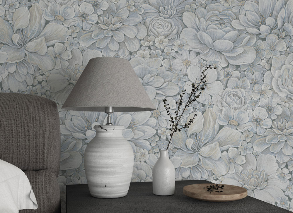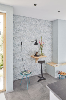 Luxusní, strukturovaná, šedo-modrá květinová vliesová tapeta s vinylovým povrchem.