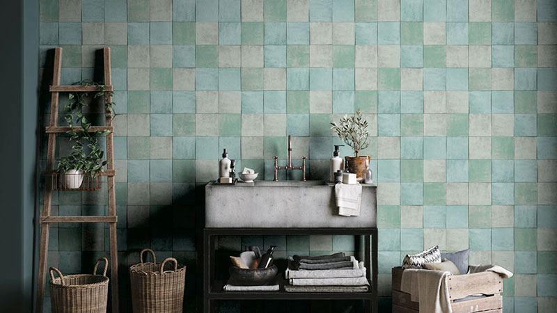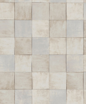 Vliesová tapeta s vinylovým povrchem, dekor světlých šedo-béžových dlaždic, jemná textura.