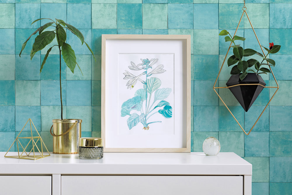 Vliesová tapeta s vinylovým povrchem, dekor zelono-tyrkysových dlaždic, jemná textura.