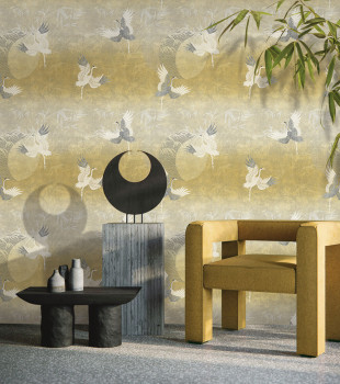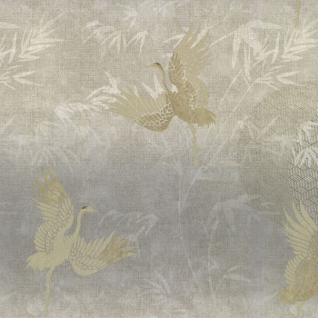 Šedo-béžová vliesová tapeta s vinylovým povrchem, motiv zlatých ptáků, textura hrubé látky.