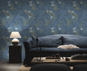 Luxusní strukturovaná modrá štuková vliesová tapeta s vinylovým povrchem, motiv rozkvetlých větviček stromu, zlaté detaily.