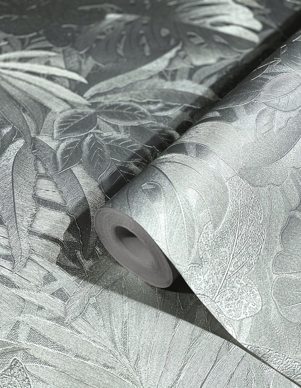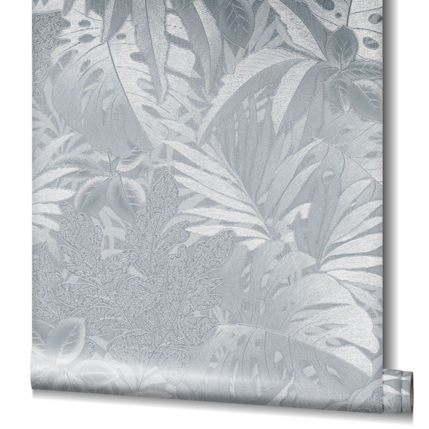 Luxusní stříbrná vliesová tapeta s vinylovým povrchem - jemně plastický vzor listy.