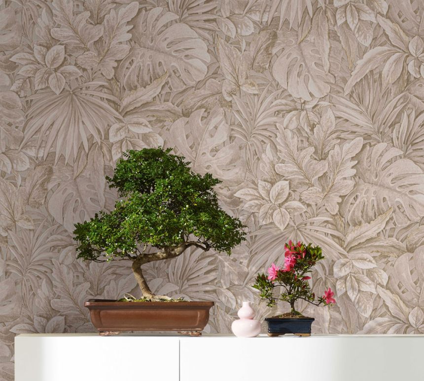 Luxusní, jemně plastická, béžová vliesová tapeta s vinylovým povrchem - listy.