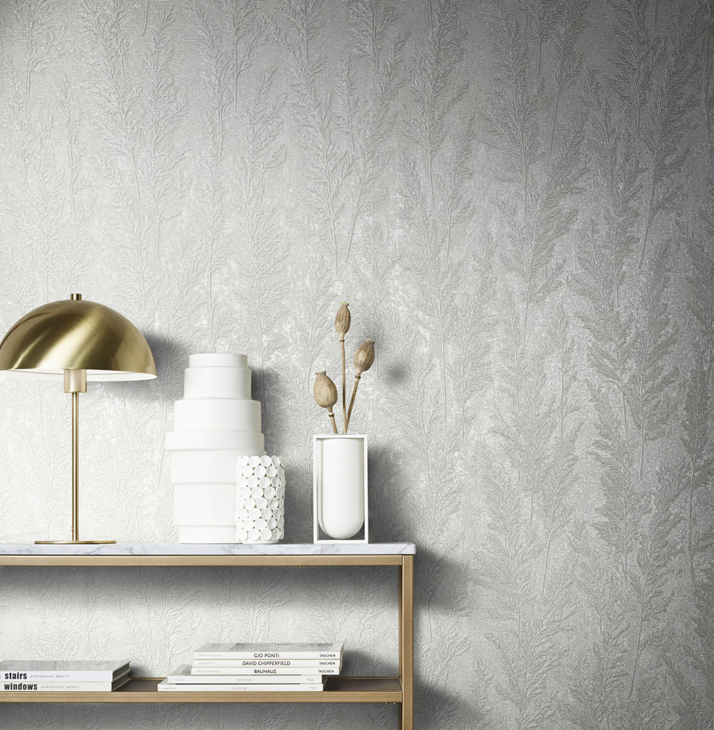 Luxusní bílá vliesová tapeta na zeď, metalické efekty, stébla trávy.