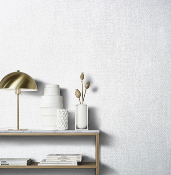 Luxusní vliesová tapeta na zeď, imitace bílé hrubé látky se stříbřitými odlesky.