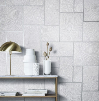 Luxusní šedo-bílá vliesová tapeta s vnylovým povrchem, imitace dřeva, dřevěného obkladu, metalické stříbrné hladké spáry.