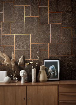 Luxusní hnědá vliesová tapeta s vnylovým povrchem, imitace dřeva, dřevěného obkladu, bronzové hladké spáry.