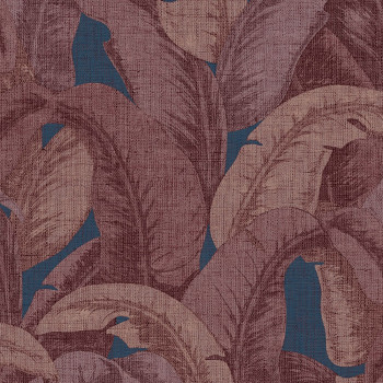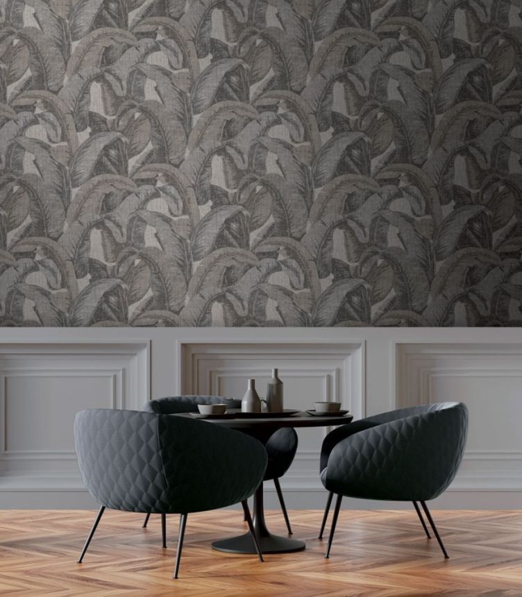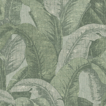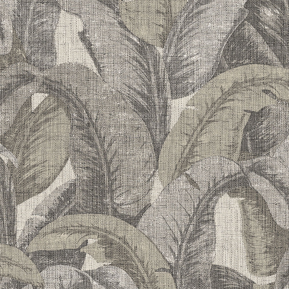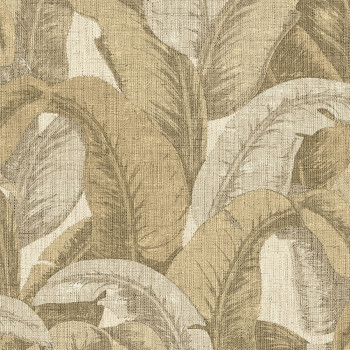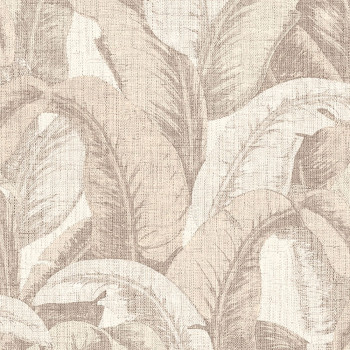 Vliesová tapeta - textura rustikální látky, design malby velkých listů. Odstíny šedé a šedo-béžové.