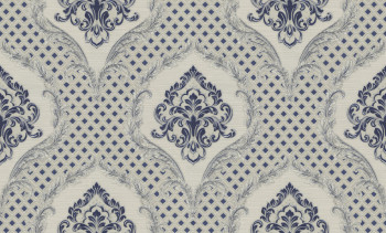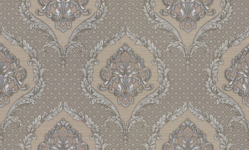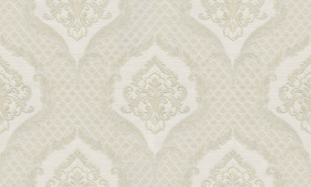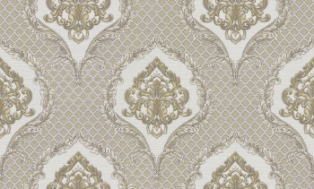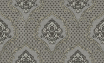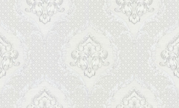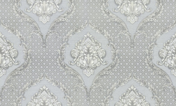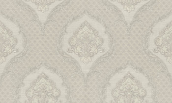 Luxusní metalická stříbrná zámecká vliesová tapeta s ornamenty na geometrickém podkladu.