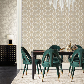 Zámecké vzory, které provází celou tapetovou kolekci, jsou inspirované luxusními orientálními látkami, a dodávají jí aristokratický a exotický nádech.