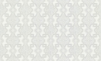 Luxusní bílo-stříbrná tapeta na zeď s geometrickými ornamenty.