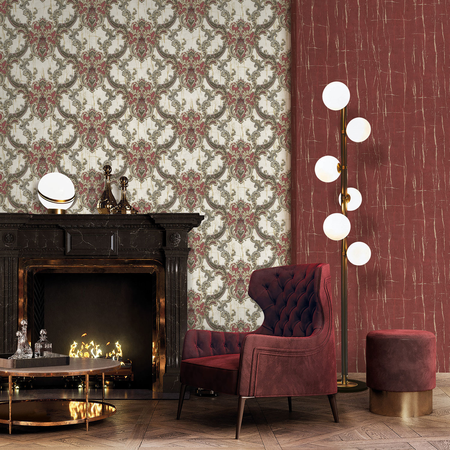 Zámecké vzory, které provází celou tapetovou kolekci, jsou inspirované luxusními orientálními látkami, a dodávají jí aristokratický a exotický nádech.