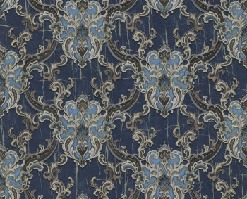 Luxusní tapeta na zeď s modro-zlatými zámeckými ornamenty na podkladě imitující omítku.