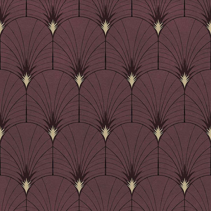Černé obrysy, matný bronzový střed vzoru, podklad vínová.