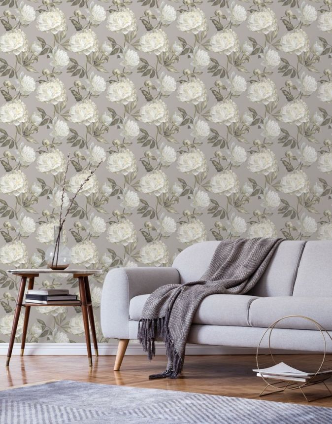 Vliesová tapeta na zeď, bílo-krémové květy pivoněk, šedý podklad.