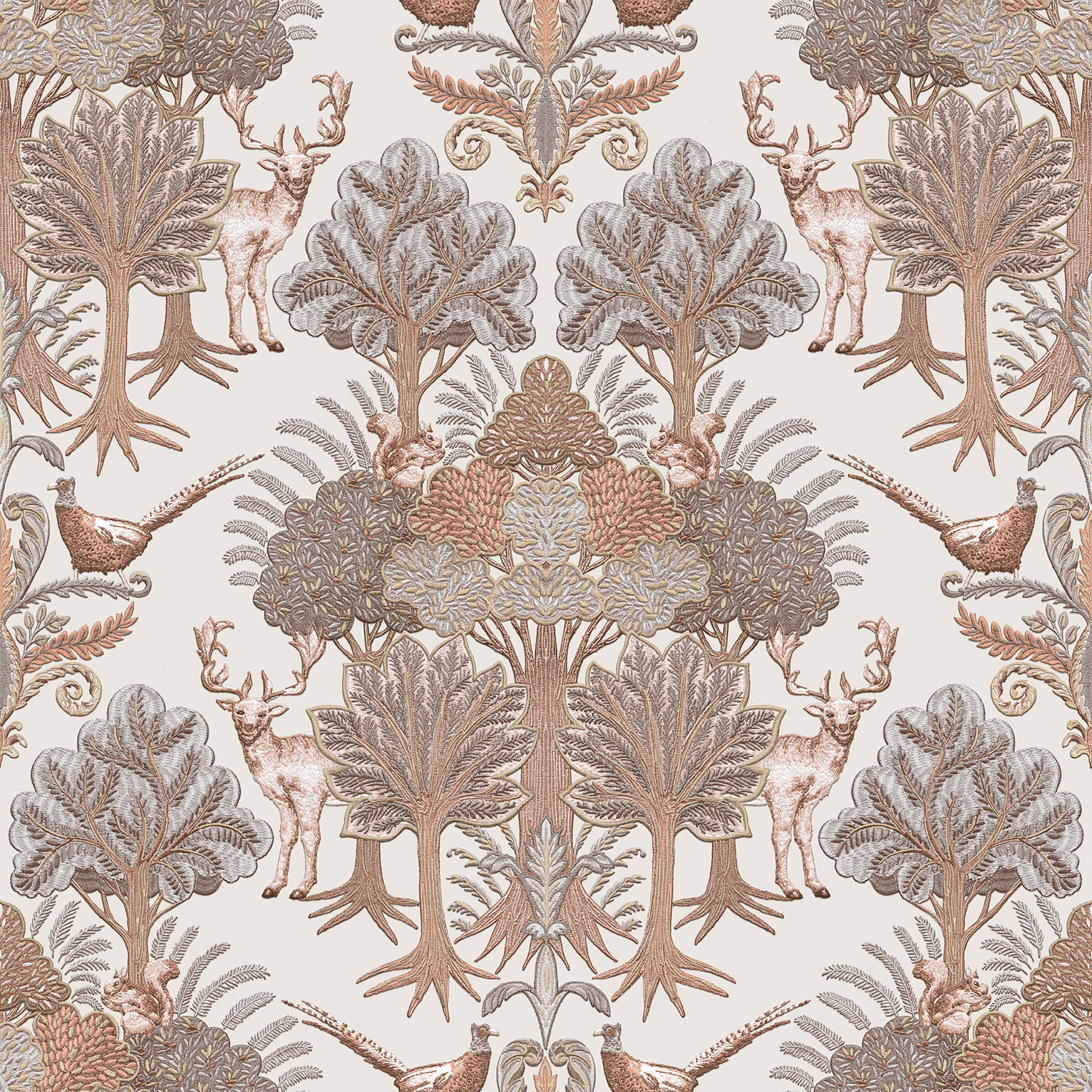 Luxusní vliesová tapeta na zeď, béžový podklad, motiv lesa a lesních zvířat v odstínech šedé a hnědé. Vzory na tapetě působí jako výšivka.