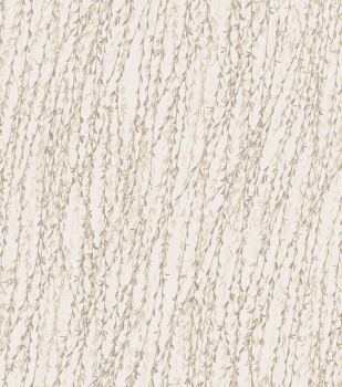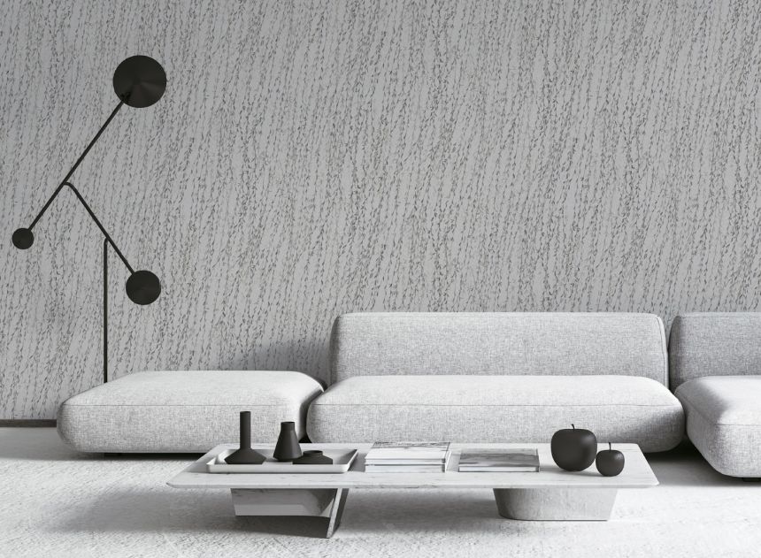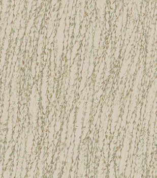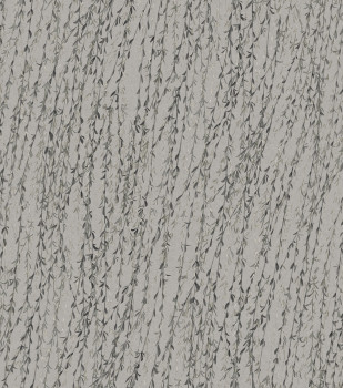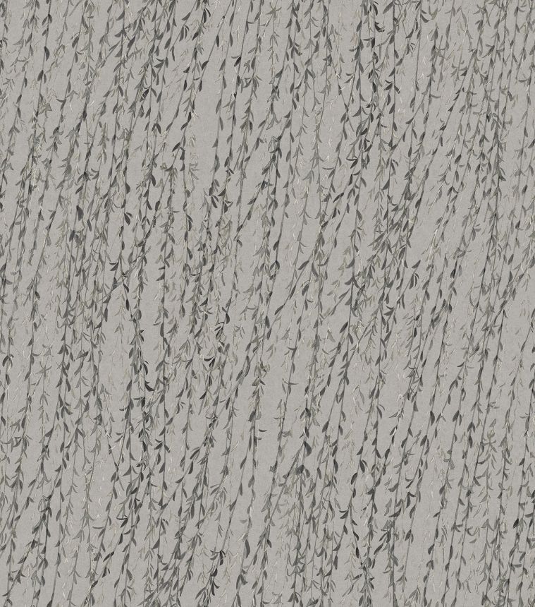 Luxusní šedá vliesová tapeta s větvičkami a listy vrby v odstínech šedé a zelené. Jemně plastická textura hedvábné látky.