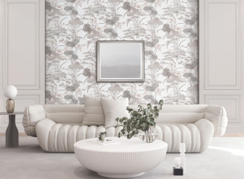 Luxusní vliesová tapeta na zeď, krémový podklad, motiv leknínů a ptáků v odstínech hnědé a béžové. Vzory na tapetě působí jako výšivka.