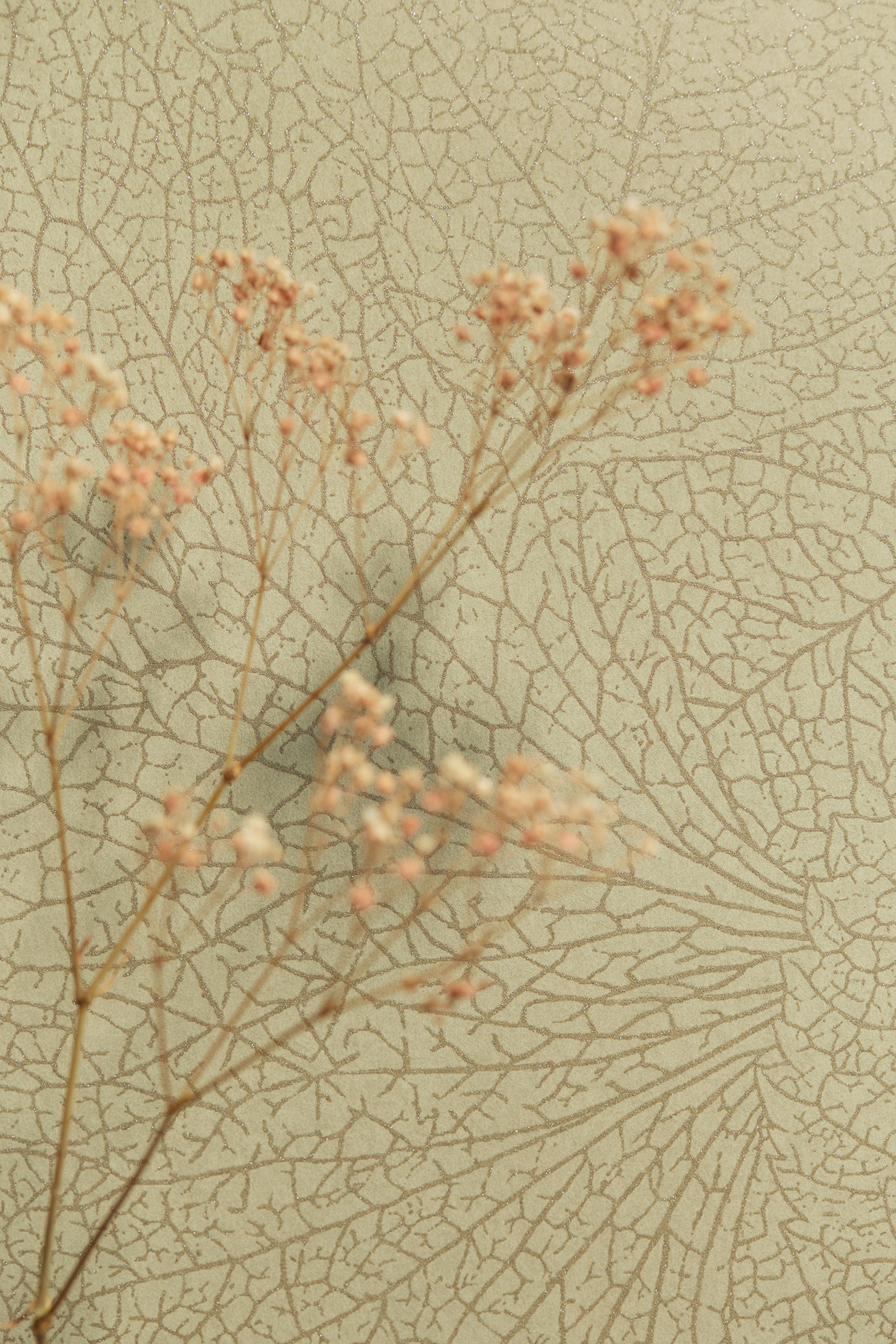 Okrovo-zelená matná vliesová tapeta na zeď, metalické obrysy listů.