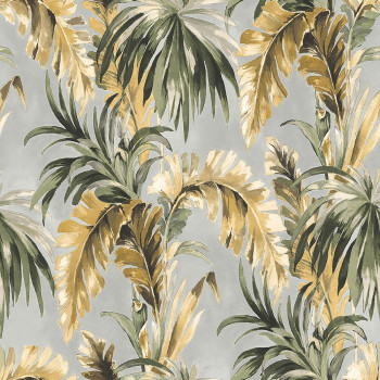 Design tropických listů v odstínech zelené a okrové, podklad šedý.