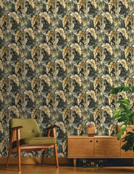 Design tropických listů v odstínech zelené a okrové, podklad šedo-černý.