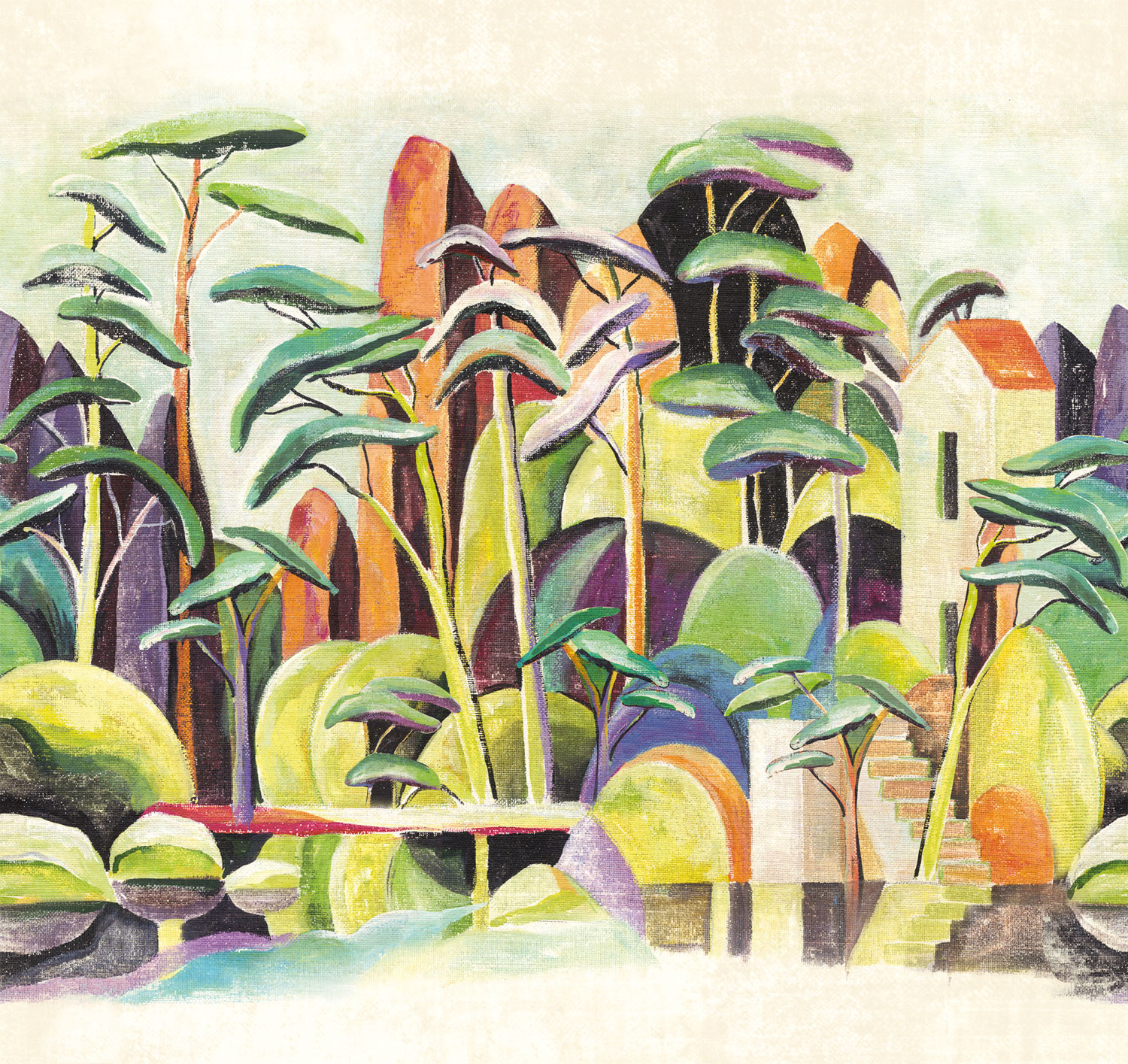 Vliesová obrazová tapeta na zeď, malba krajiny s domečkem.