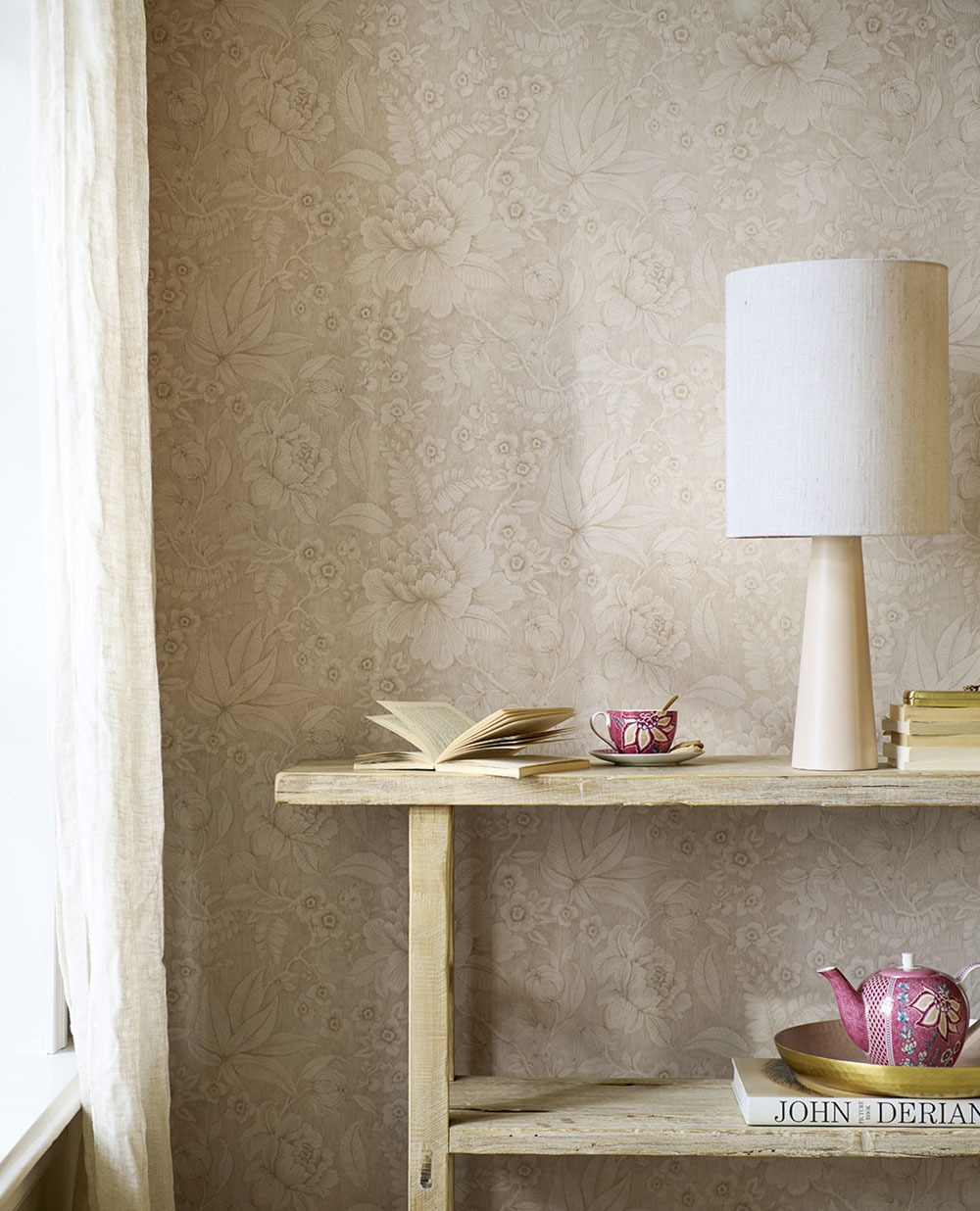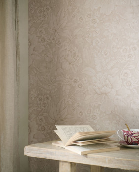 Béžová vliesová tapeta na zeď, romantický květinový vzor.