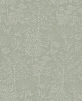 Matná zelená vliesová tapeta s metalickým stříbrným vzorem stromů, listů a ptáků.