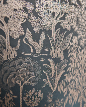 Modrá hladká matná vliesová tapeta na zeď, kovově lesklý vzor se stromy a ptáky.