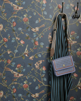 Hladká tmavě modrá vliesová tapeta na zeď, Tapeta s rozkvetlými větvičkami a ptáčky, místy lesklé detaily.