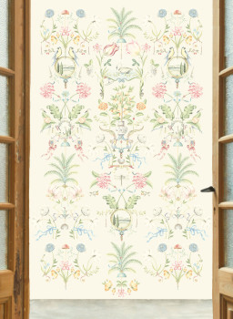 Jemně strukturovaná, romantická vliesová obrazová tapeta na zeď, rostlinné motivy, květiny, ptáci. Rozměr tapety 159x280cm, 3díly 53x280cm.