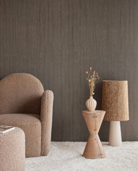 Hnědá vliesová tapeta s vinylovým povrchem, imitace mačkané hrubší látky, kovový pololesk.